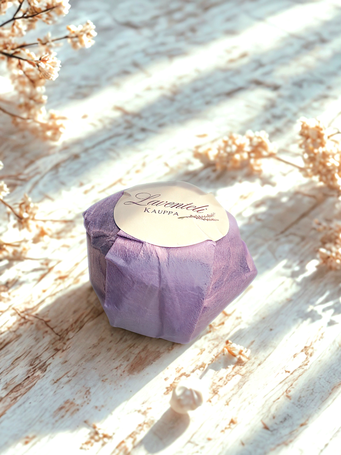 Laventelinen kylpypommi sopii loistavasti lahjaksi, tai lisänä omaan hemmotteluhetkeen! Laventelin rauhoittava tuoksu auttaa rentoutumaan ja hellii myöskin ihoa. Kylpypommin sisältämät suolat ja luonnolliset öljyt kosteuttavat ja rauhoittavat ihoa, ja rentouttavat koko kehoa.