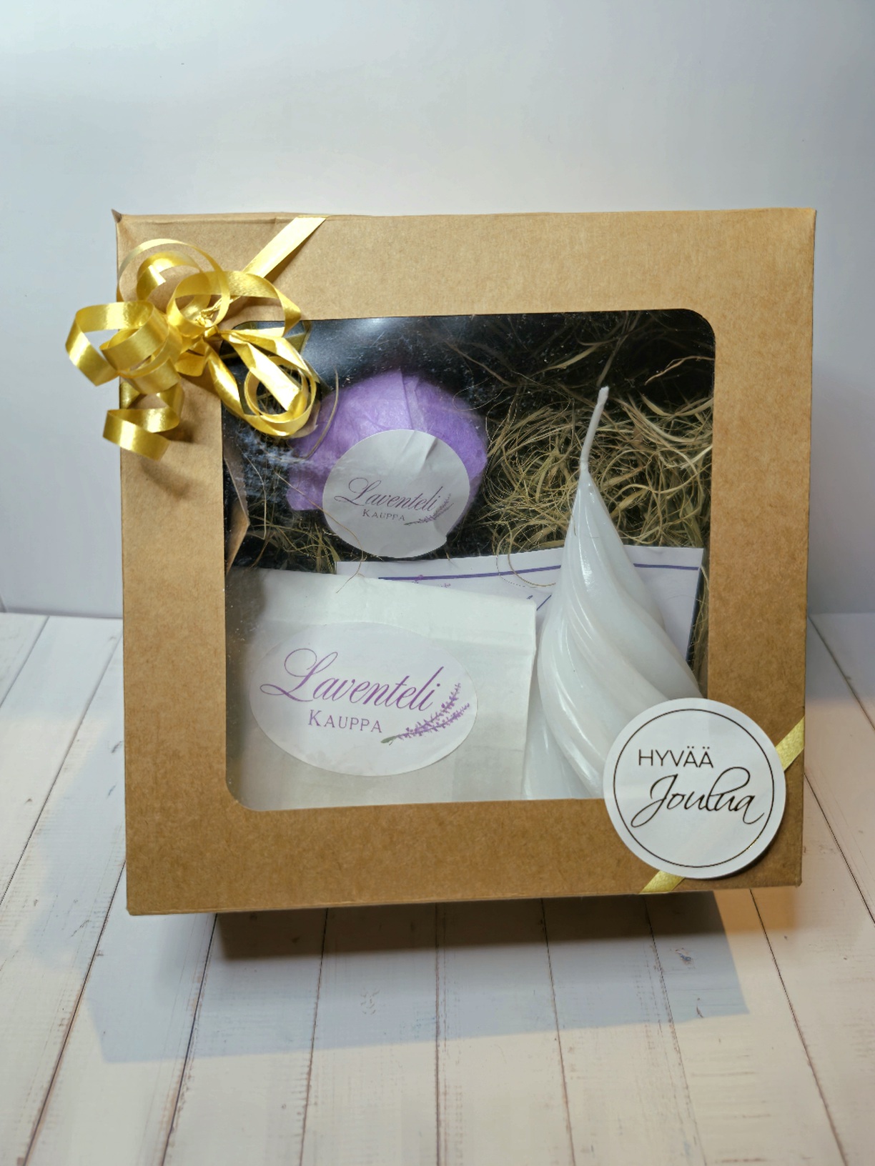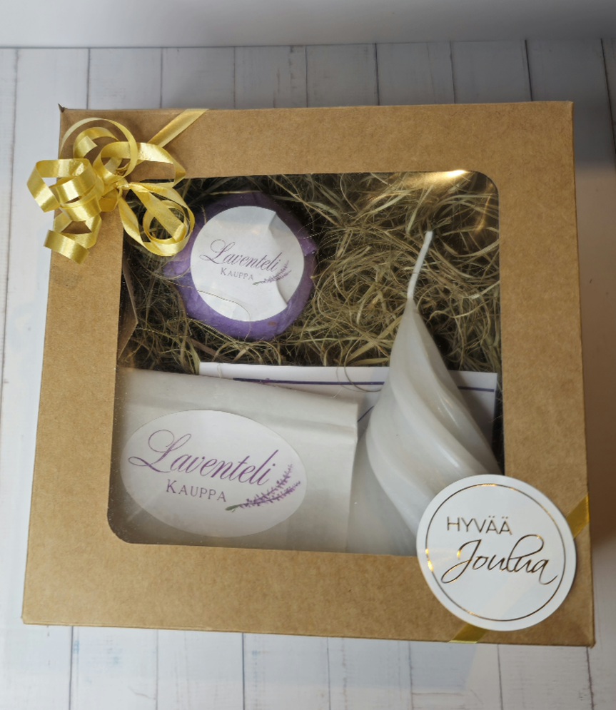 Tarjoa ystävällesi tai läheisellesi lahjaksi lempeä hemmotteluhetki laventelin tuoksussa! Tämä rakkaudella koottu paketti sisältää annoksen jalkakylpysuolaa, kylpypommin, sekä spiraalikynttilän. Näiden avulla rakentuu helposti pieni rentouttava koti-spa hetki!