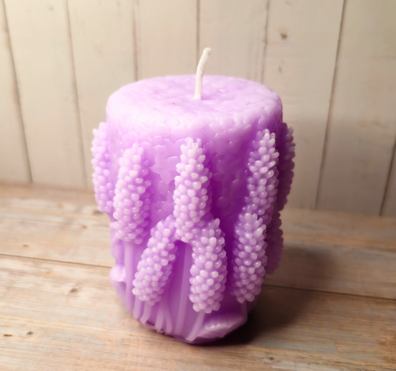 Kaunis lila kynttilä laventelinkukka kohokuviolla koristaa upeasti kotia.